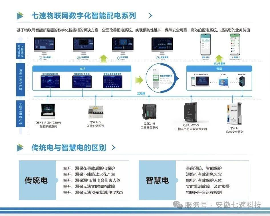 盡管許多工廠已經安裝了傳統的電氣監測設備,但這些設備往往在火災發生后或問題變得嚴重時才能發出警報,對于預防火災而言,存在一定的局限性。為了更有效地解決過載、短路、接觸不良、漏電及管理與維護不足等問題,可以采用“七速科技智慧安全用電系統”,將電氣事故的防治從“事后補救”轉變為“事前預防”。